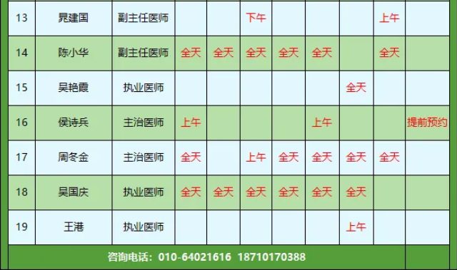 2.如遇特殊情況,個(gè)別醫(yī)生出診時(shí)間會(huì)稍有變動(dòng),就診前請(qǐng)聯(lián)系客服確認(rèn),具體排班以當(dāng)天出診為準(zhǔn),敬請(qǐng)諒解~