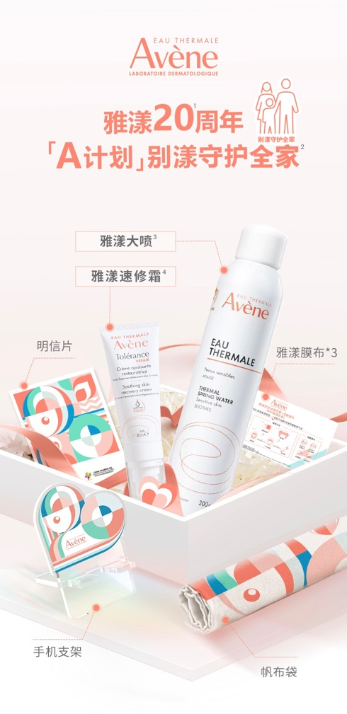 雅漾A計(jì)劃慈善禮盒由雅漾邀請(qǐng)藝術(shù)家Jen Du聯(lián)合創(chuàng)作,勾畫出雅漾入華二十周年的“20”字樣,并借由精巧布局,在泉水與自然元素中隱隱展露出一張孩子的笑臉。禮盒內(nèi)含雅漾皮膚科實(shí)驗(yàn)室最新研究成果雅漾速修霜、經(jīng)中國(guó)消費(fèi)者多年口碑認(rèn)證的雅漾噴霧,以及可與雅漾噴霧結(jié)合、可用于濕敷的面膜紙,以便捷的“打包式解決方案”幫助肌膚收獲舒緩力量,遠(yuǎn)離敏感問(wèn)題困擾。雅漾還為購(gòu)買禮盒的每位消費(fèi)者準(zhǔn)備了精美周邊和特殊感謝信,以此感恩雅漾會(huì)員持續(xù)二十年的信賴,以及他們對(duì)公益事業(yè)的貢獻(xiàn)。