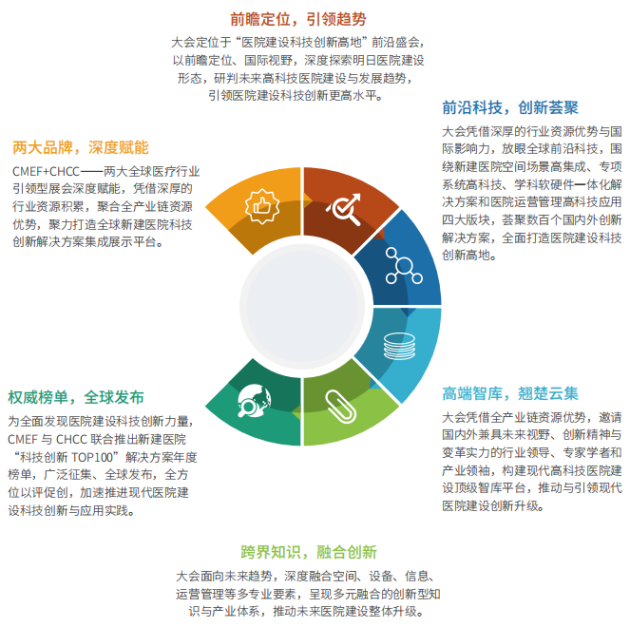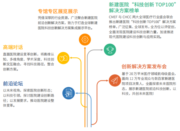 作為定位于“醫(yī)院建設(shè)科技創(chuàng)新高地”的前沿盛會(huì),本屆大會(huì)立足國內(nèi),放眼全球,聚焦國內(nèi)外醫(yī)院建設(shè)領(lǐng)域科技創(chuàng)新與應(yīng)用實(shí)踐,以“科技創(chuàng)新,預(yù)見未來醫(yī)院”為主題,通過前沿論壇、高端對話、專館專區(qū)展覽展示、創(chuàng)新解決方案發(fā)布等,全面探索未來醫(yī)院建設(shè)科技創(chuàng)新趨勢,充分展示全產(chǎn)業(yè)鏈科技創(chuàng)新成果,引領(lǐng)醫(yī)院建設(shè)科技創(chuàng)新更高水平。同時(shí),CMEF 與 CHCC 聯(lián)合推出新建醫(yī)院“科技創(chuàng)新 TOP100”解決方案榜單,廣泛征集、全球發(fā)布,全方位以評促創(chuàng),全面發(fā)現(xiàn)醫(yī)院建設(shè)科技創(chuàng)新力量,深度挖掘未來醫(yī)院的科技策源,加速提升醫(yī)院建設(shè)科技創(chuàng)新水平。